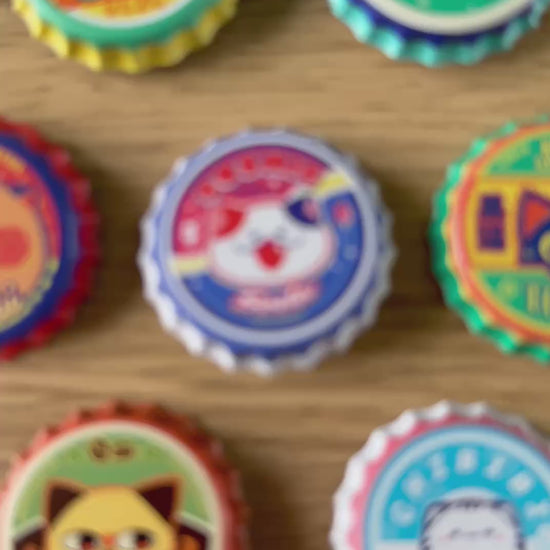 Satisfy your thirst for fun without the calories! These adorable bottle cap badges let you enjoy all the refreshment vibes of your favorite drinks in collectible form. Perfect for showing off your love of classic beverages caps with a playful twist. Featuring: